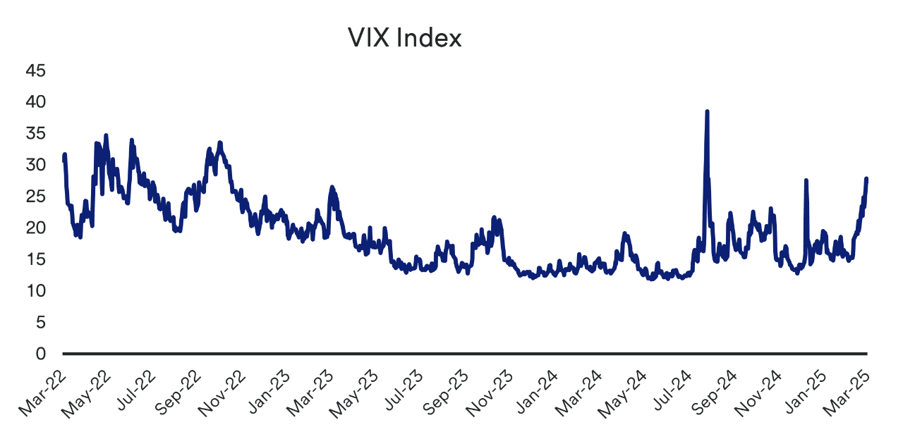 After two consecutive years of 25% returns for the S&P 500 in 2023 and 2024, it should perhaps be expected that the sluggish start to 2025 for domestic equities has unnerved investors. While macroeconomic conditions and the corporate earnings environment continue to look decent, there have been two catalysts behind the relatively weak start to the year for domestic equities and the increase in market volatility we have been observing: