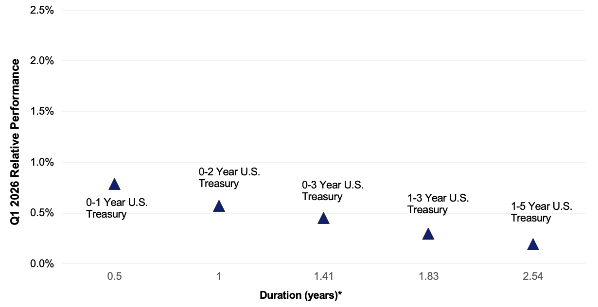 U.S. Treasury yields moved higher across the curve with the most pronounced increases occurring in the front and intermediate maturities. Against this backdrop, duration positioning was a meaningful driver of relative performance. Returns were tightly aligned with duration levels, with each incremental increase in effective duration corresponding with progressively lower returns. The roughly 60 bps performance gap between the 0-1 Year U.S. Treasury and the 1-5 Year U.S. Treasury is significantly wider than we have been accustomed to in recent quarters. Periods like this underscore that front-end yields can be the most sensitive to macro developments, and further, that Fed policy expectations remain fluid.