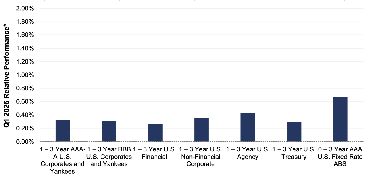 Credit spread movements in Q1 were somewhat mixed. Sectors such as Agencies, AAA Corporates, and AAA ABS tightened modestly reinforcing investors' preference for high quality credit. By contrast, lower-rated corporate segments experienced mild spread widening. Importantly, the magnitude of this move does not currently signal any broad deterioration in credit conditions. Investment grade corporate credit spreads remain near multi-year lows, and we continue to be constructive from a fundamental standpoint. Elevated all-in yields, particularly in the front end of the curve, helped to absorb higher new issue volumes.