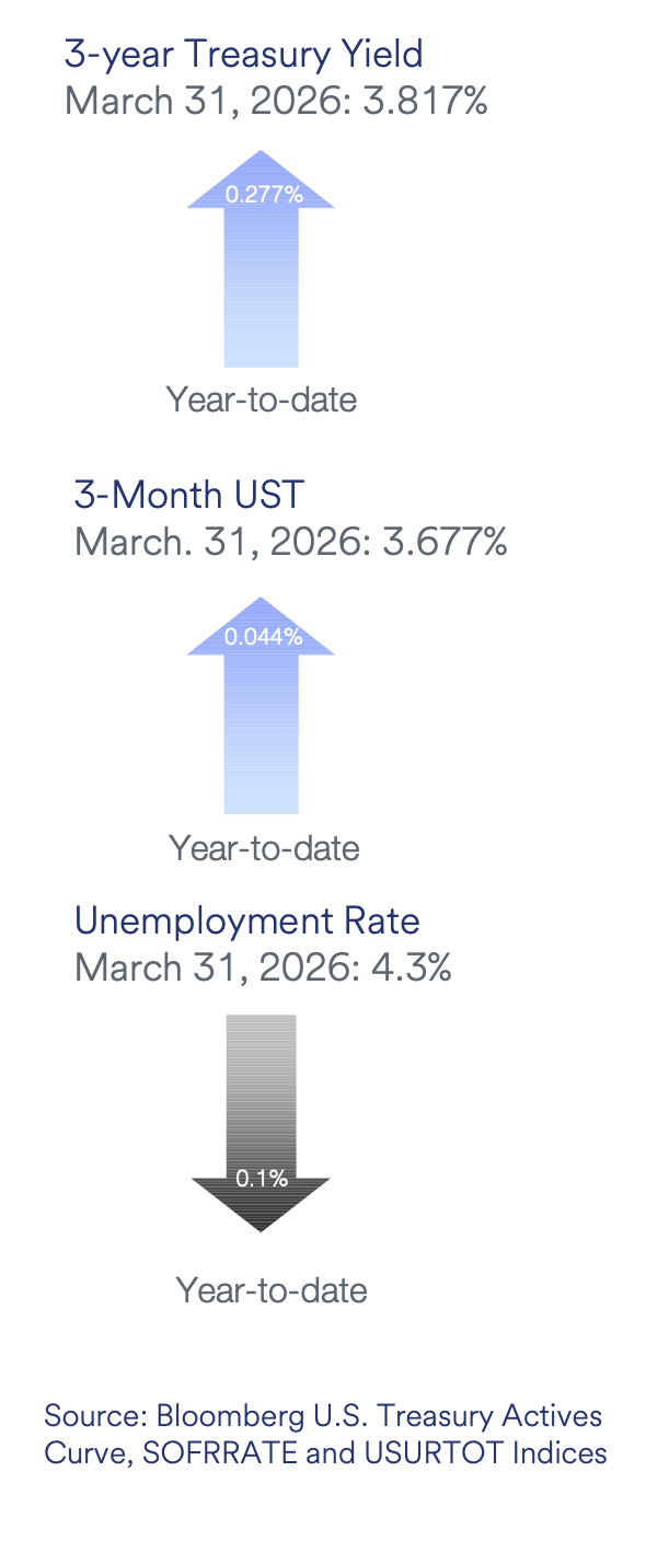 Economic Activity – U.S. economic activity during the first quarter of 2026 (Q1) reflected a stable yet cautious expansion, with moderate growth persisting despite rising geopolitical concerns. U.S. Gross Domestic Product (GDP) growth is projected to be near 2.0-2.5% in Q1, supported by consumer spending and business investment. Growth was further aided by a rebound in government activity following the extended federal government shutdown in the fourth quarter of 2025. Consumer spending ended the quarter on firmer footing after a weak start, with positive momentum leading into the conflict in the Middle East. While aggregate spending remains resilient, it has become increasingly concentrated among high-income households, raising concerns about the sustainability of a two-speed growth trajectory amid the recent surge in energy costs. Employment conditions continue to exhibit monthly volatility, but overall trends imply labor market resilience and stabilization as the low-hire, low-fire environment persists. U.S. job openings fluctuated throughout the quarter but maintained their broader downward trend, with February openings at 6.9 million versus 7.2 million total unemployed workers in March. Monthly Nonfarm Payrolls (NFP) growth averaged 68,000 per month during the quarter, an acceleration compared to the prior quarter, but well below historic levels. Low payroll growth is not inherently bad as low layoff activity and slower labor force growth have helped stabilize the unemployment rate, which the Federal Reserve (Fed) views as a more reliable gauge of labor market health. The U3 Unemployment Rate was 4.3% as of March. Average hourly earnings continued their gradual descent, rising 3.5% year over year in March. Inflation pressures accelerated to close out the quarter, with the headline Consumer Price Index (CPI) rising 3.3% in March, reflecting a sharp increase in energy prices. Core CPI (excluding food and energy) remained more subdued at 2.6% year over year, while the Fed’s preferred inflation measure, the core Personal Consumption Expenditures (PCE) deflator, rose 3.0% year over year in February. The extent to which higher energy prices feed into core inflation is less clear and will depend on the duration of the Middle East conflict, but poses a greater risk given the downside to growth and the Fed’s limited capacity to respond.