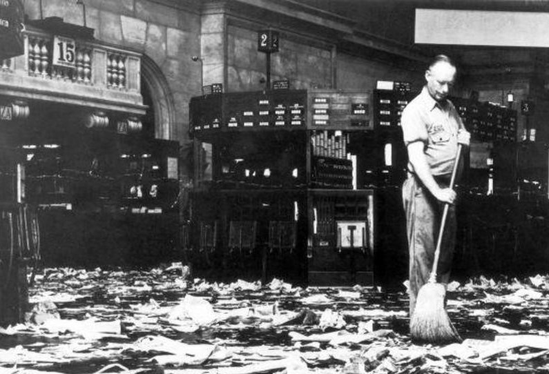 October 29th, Black Tuesday, began with unprecedented trading volumes and investors scrambled to get out while they could - about 16 million shares were traded and some sellers could not find anyone willing to buy their stocks at all. Again, leaders in the financial world attempted to shore up the market by buying large quantities of stock to demonstrate consumer confidence - it didn't work. The trading volume was so large that purportedly the ticker tapes didn't finish reporting until 7:45 p.m. The DJIA closed that Tuesday at 230.07, down over 30 points.