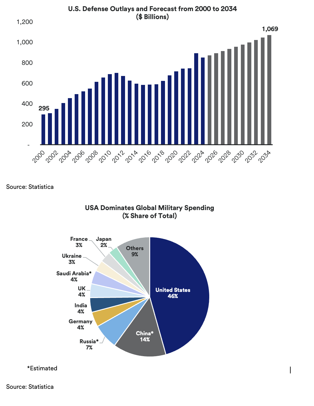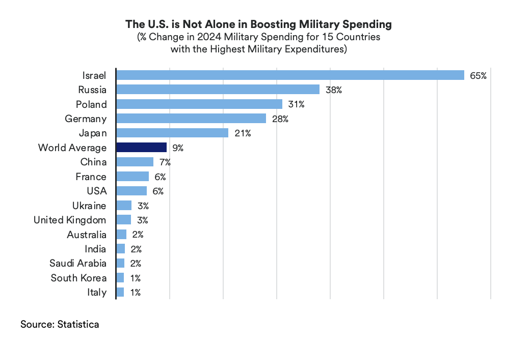 The Aerospace & Defense (A&D) sector encompasses products and services for both commercial and government markets. These companies produce some of the world’s most technologically sophisticated commercial aircraft, fighter jets, bombers, helicopters, missiles and air defense systems, submarines, aircraft carriers, tanks, ground vehicles, and munitions. Some companies enjoy significant revenues from foreign purchasers, while others depend almost entirely on the U.S. government. The U.S. is the world’s largest market for A&D, accounting for almost half of global 2024 spending (see table below).